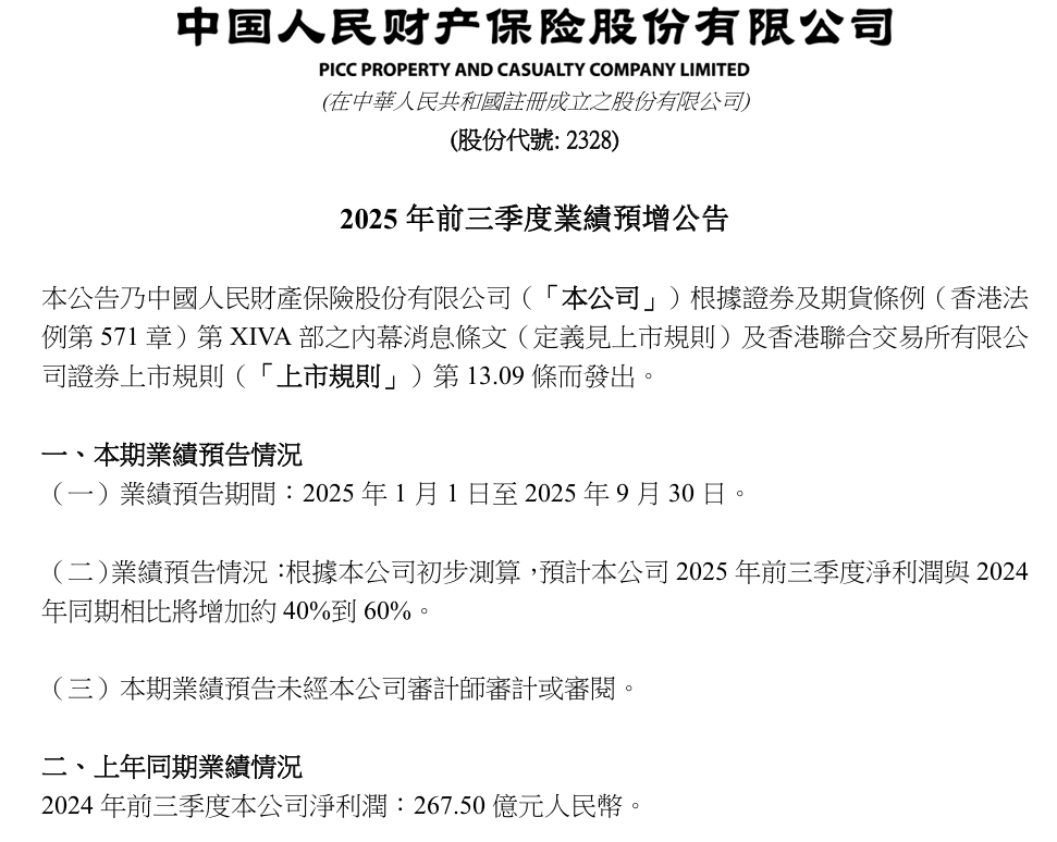 公告显示,业绩预告期间为2025年1月1日至2025年9月30日,根据中国财险初步测算,预计公司该期间净利润与2024年同期相比将增加约40%到60%,而2024年前三季度人保财险净利润为267.5亿元。